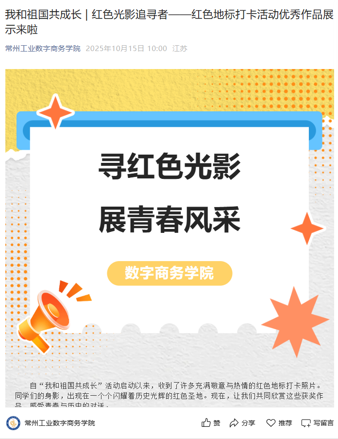 自国庆中秋双节以来,数字商务学院“E路行摄”辅导员工作室精心策划并组织开展了“我与祖国共成长”网络育人主题系列教育活动,得到了全院学生的广泛关注和积极参与。同学们通过镜头与笔触,深刻感悟国家发展的伟大历程,表达了与祖国同呼吸、共命运的坚定信念。