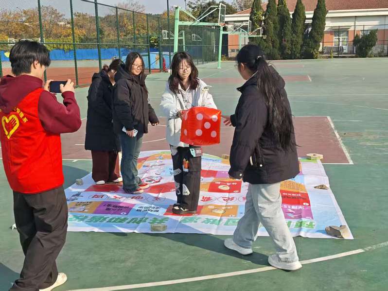 “团体游戏派对”如期开展,四项趣味集体游戏接连上演,点燃了校园的欢乐氛围。“丢手绢”游戏中,追逐的欢笑与被追及同学分享的开心小事相映成趣;“大富翁协作赛”创新融入情绪互动元素,抽到“烦恼卡”的同学勇敢倾诉压力,队友们携手出谋划策闯关,在协作中收获支持;“同舟共济(两人三足)”与“背部夹球赛跑”则重点考验搭档默契,从初始的步伐紊乱到后期的协调同步,同学们用坚持与配合诠释了团结的意义,每一次成功闯关都伴随着全场热烈的掌声,让大家在欢乐中增强了团队意识。