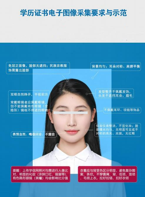 • 个人规范要求:学生拍摄时须严格服从现场工作人员指挥,规范着装、妆容及姿势,确保图像信息符合学历证书及学信网注册要求,具体要求如下: