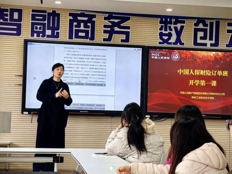 近日,我校数字商务学院金融服务与管理专业“中国人保财险订单班”迎来了开班第一课。人保财险常州市武进支公司团队经理、订单班导师陈丽走进校园,为订单班同学带来了一场内容丰富、案例生动的专题讲座。此次课程开班标志着订单班人才培养工作全面启动,校企协同育人迈入实质性阶段。